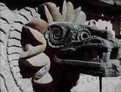 Son nom signifie "serpent à plumes" et "jumeau précieux", il était une divinité majeure du panthéon aztèque, aux origines archaïques. En tant que l'un des quatre dieux créateurs, il joua un rôle déterminant dans le mythe des cinq Soleils. Il revêtait aussi de nombreuses formes, les plus célèbres étant le dieu du vent Ehecatl et le Serpent à Plumes. Les Aztèques intégrèrent Quetzalcoatl et le vénérèrent comme patron des prêtres, inventeur du calendrier et protecteur des artisans. Dans une autre version, Quetzalcoatl s'embarqua sur un radeau de serpents et disparut à l'horizon vers l'est en promettant de revenir un jour, lors d'une année placée sous le signe du roseau. On racontait que le dieu avait la peau clair et était barbu. Et L'empereur Moctezuma a toujours vécu dans l'idée que Quetzalcoatl reviendrait lors de son règne. Le 18 Novembre 1518 , une flotte composée de 11 navires dirigé par le capitaine espagnol Hernán Cortès accosta. Pensant à tord qu'il était le messi, l'empereur l'acueillit comme tel. C'est ainsi qu' Hernán Cortès, parti à la conquête de la Nouvelle Espagne, ne connu aucune résistance du peuple Aztèque et se retrouvit couvert d'or ... en semant derrière son passage pillages et massacres. Quand l'empereur se rendit compte qu'il n'était pas celui qu'il pensait, il était trop tard... et fut aussi massacré.