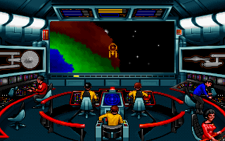Les graphismes AGA en 256 couleurs sont superbes, fins, détaillés, identiques à la version PC disquettes. Ils arrivent à retranscrire parfaitement l'ambiance de la série, on reconnaît facilement les personnages jusqu'aux oreilles pointus de Spock. Beaucoup de petites animations viennent donner vie à l'univers de la série, voir les personnages se téléporter est un vrai régal, les bruitages digitalisés de la série allant du bruit des computers de la passerelle, le son du communicateur et le fameux bruit de la téléportation.... Les thèmes musicaux ont été aussi retranscrit assez fidèlement. Interplay n'a donc pas fait les choses à moitié et on sent que la réalisation a été peaufiné même si quelques lacunes demeurent comme une interface pas très ergonomique, et certains graphismes, certes rares, moins bons que d'autres comme par exemple la surface d' Alpha Proxima qui n'occupe pas tout l'écran ou dans la forêt sur Pollux V. Comme dessiné par des artistes aux talents différents. Un point de détail certes qui n'entache pas la qualité globale du soft, pas vraiment gênant mais donnant un sentiment d'une qualité hétérogène qui mérite d'être signalé. Le défault du jeu est en fait ailleurs et vous ne le découvrirez que bien plus tard dans l'aventure, après avoir effectuer plusieurs missions et pour ainsi dire à la toute fin du jeu. Cette fin propose un combat spatial vous opposant à un faux vaisseau Enterprise et à deux vaisseaux des pirates Elasis, ce combat est quasiment impossible à gagner tant la difficulté est très très élevée et mal dosée. Les trois vaisseaux ennemis sont bien plus forts et plus rapides que vous, mieux armés et ils se régénèrent plus vite à vos attaques... bref en m'y accrochant j'y suis arrivé après plusieurs jours d'acharnement ! oui plusieurs jours et avec des sauvegardes fréquentes quand j'estimais avoir avancer suffisamment dans le combat. Néanmoins hormis ce défaut, la majorité du jeu est bien entendu d'une grande qualité.