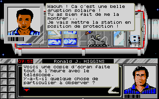 Sur la conception... Etant jeune j'avais été fasciné par les premiers vols spatiaux, les programmes Mercury, Gemini puis Apollo et je mettais un point d'honneur à être très proche de la réalité au niveau scientifique. Comme toujours, on a travaillé avec une documentation très importante. Pour aller plus loin, avec Roland Morla, le programmeur et Marie-Anne Alison, qui m'assistait à la réalisation, nous sommes allés faire un séjour de plusieurs jours avec les instructeurs du "Space camp" de l'astronaute Patrick Baudry. Ce centre proposait à des jeunes des stages d'initiation aux techniques spatiales et disposait, entre autres, d'une maquette de navette grandeur nature... et d'une vraie centrifugeuse qui nous a permis d'encaisser quelques accélérations mémorables.