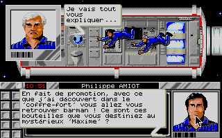 Pour "Meurtres dans l'espace" le changement était minime puisque nous avions remplacé le déplacement d'un curseur sur un plan par celui du personnage dans le décor. Cela correspondait à une évolution des possibilités graphiques mais le fonctionnement général du jeu restait identique dans le principe... avec les "mini jeux " intégrés dans l'intrigue principale et la présence d'indices. La fabrication était d'ailleurs un cauchemar pour le responsable d'Infogrames qui n'avait pas l'habitude de ces boites remplies à ras-bord (et même plus... elle restait un peu bombée tant elle était pleine) à côté d'autres packagings qui contenaient beaucoup de vide !
