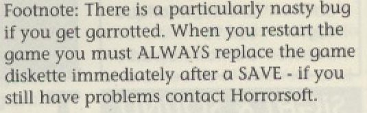 Pour info, j'ai testé la version Amiga en faisant exactement les mêmes actions, et effectivement, le message avec l'étrangleur n'apparaît pas - on peut tranquillement explorer le chalet, aller à la cabane du fond, bref, continuer le jeu...