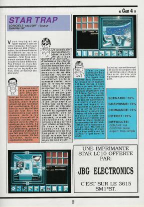 "Star Trap" est un bon jeu mais qui manque d'une finition digne du ST. Graphisme assez peu coloré, icône à profusion et fenêtre assez réduite, un jeu qui aurait pu être un hit avec un peu plus d'attention mais qui enchantera ceux qui ont aimé Zombi d' Ubi Soft. Enfin moi j'aime !!! Je laisse maintenant la parole à Tonton Bruno qui vous parlera de la version CPC.