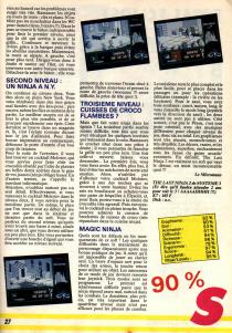 La partie commence en haut d'un immeuble en plein Central Park, la première règle est donc de se familiariser avec les mouvements, enfin on fait ce qu'on peut. Un coup je veux me retourner mais je recule, je veux avancer mais il ramasse... bref très vite on se rend compte que c'est pas très instinctif tous çà. Finalement sur ce premier écran rien à faire mais passer derrière le rideau et là premier couac, les bugs c'est du grand n'importe quoi. Vous avez déjà du mal à passer derrière le rideau, ce foutu rideau, votre ninja se coince de temps en temps c'est pas méchant mais vite énervant surtout quand un ennemi vous matraque de coup de poings. Un problème récurrent dans ce style de jeu en 3D isométrique comme dans Where Time Stood Still testé aussi sur le site, mais c'est hyper énervant et je déconseille ce jeu aux nerveux car le matos volent droit dans le mur et ma chère manette speedking (paix à son âme) sur Amstrad a bien morflé à l'époque. Bref vous n'arrivez pas trop à savoir pourquoi ni comment passer derrière ce foutu rideau et c'est un peu comme cela tout le long du jeu. Et c'est tellement mal foutu qu'un petit mouvement de travers et hop vous repassez le l'autre côté. Je dois être une quille car parfois je m'y suis repris 10 fois pour arriver à passer ce foutu rideau et c'est juste le premier écran, ce n'est même pas censé être une difficulté du jeu (mais merde c'est en plus que le premier écran), sans cesse j'étais renvoyé dans l'autre écran et contrairement à Ninja Remix les graphismes se dessinent petits à petits comme sur C64, donc ca rallonge encore plus les délais d'attente... arghh !! j'en peux plus, je craque !!! En plus on a l'impression que le jeu enregistre encore vos mouvements pendant que les graphismes se dessinent à l'écran et donc quand c'est fini de charger il les exécute et là vous pouvez repasser de l'autre côté et ca se redessine ! infirmière ! je veux mes cachets ! vite !