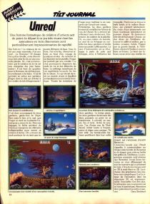 Unreal était composé de deux parties distinctes, une pseudo 3D à la Space Harrier, et une partie 2D en défilement horizontal. Dès le départ nous avons organisé le jeu de cette façon pour pouvoir travailler chacun de façon la plus indépendante possible. La raison était la distance qui nous séparait, puisque Yves et moi étions rentrés en Belgique et Marc était retourné à Lyon tandis que Yann habitait en Bretagne. J'ai donc travaillé avec Yann sur la partie 2D, et Marc et Yves sur la pseudo 3D. J'ai réalisé tous les graphismes des niveaux 2D à l'exception de quelques sprites. J'ai aussi fait un ciel pour la pseudo 3D ainsi que les sons. J'ai toujours eu un petit faible pour l'audio qui passe souvent au second plan, j'ai donc insisté pour y consacrer des ressources afin d'avoir de l'audio de qualité dans le jeu.