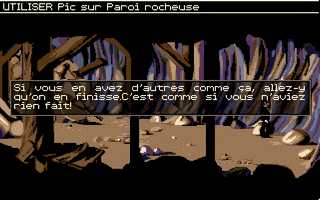 Pour les actions on a affaire parfois à quelques étrangetés, par exemple dans la grotte vous mettez la main sur un pic, une fissure dans la paroi rocheuse et l'air qui en sort vous guidera logiquement vers une action de type "UTILISER PIC SUR PAROI ROCHEUSE", sauf que cette action aboutie à des messages de type "METTONS QUE VOUS N'AVEZ RIEN DIT". Au début on se dit que peut être on a cliqué au mauvais endroit ou qu'on est mal positionné, trop loin de la paroi, as t-on oublier une action avant ? mais non, la solution il faut faire "ACTIONNER PIC" ! pour se mettre à creuser la paroi, logique !
