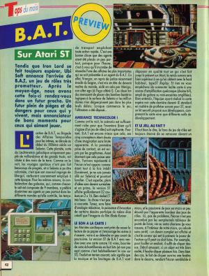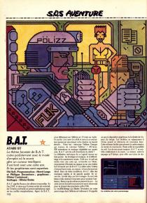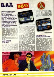 Et B.A.T ne déroge pas à la règle, car déjà en octobre 1988 on pouvait contempler les premières images de ce chef d'oeuvre créé par une toute jeune équipe Computer's Dream composée essentiellement de Philippe Derambure, Olivier Cordoleani (graphiste) et Hervé Lange (programmeur), ces 2 derniers ayant déjà travaillé ensemble sur Fer & Flamme sur Amstrad pour Ubi Soft, et une version Atari ST qui ne vit malheureusement jamais le jour justement car ils réfléchissaient déjà à ce qui devriendra le futur jeu B.A.T. Leur idée était de développer un jeu de rôle-aventure dans un univers futuriste complet et non linéaire de style cyberpunk. Simple à dire mais ce fut une autre paire de manche pour le réaliser, il a fallu tout d'abord se pencher sur le scénario et mettre en place toute l' histoire découlant jusqu'à la menace de Vrangor. Un scénario très bien ficelé, inspiré des romans dits d' anticipation comme celui de Philip K. Dick "Do Androids Dream of Electric Sheep ?" qui a donné le film Blade Runner. On y retrouve une certaine moralité humaine, la recherche du mal (incarné ici par Vrangor) et une certaine dégénérescence de la société (La violence de Terrapolis, la ville est plongé dans une pénombre constante). D'ailleurs le scénario est écrit comme un vrai préambule de roman et pour accentuer ce réalisme, un extrait des "Chronique Terriennes" vous dévoile comment l' exploitation humaine, le libéralisme économique et l' ingérence scientifique (la génétique...) ont conduit à la perte de tout pouvoir du gouvernement face aux Trusts industriels; Aussi par crainte d' une crise planétaire, il fut décider de créer des quotas et des lois de contrôles de ces Trusts, qui finirent par quitter le sol terrestre vers des horizons plus "libéraux" comme Selenia planète du système B-15, on se croierai presque un sujet d'actualité. Vous trouverez même un glossaire du monde de B.A.T, une mini-BD, des croquis sur le style vestimentaire du futur et un fac sur un extrait de journal sur l'explication sur la théorie du pont Einstein-Roben ou plus communément "le voyage inter-stellaire".