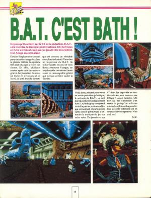 B.A.T demeure encore de nos jours un jeu unique par son ambiance, son scénario et réussi le pari fou de mélanger les genres sans toutefois égaler les meilleurs jeux qu'il essaye de réunir. On pourra lui reprocher une prise en main trop longue et grande difficulté dans les souterrains de Selenia, la durée de vie n'en est que plus élevé et on a en pour son argent. Pour fini B.A.T a reçu maintes récompense et eut un énorme succès, qui engendra en 1992 une suite appelée B.A.T II - The Koshan Conpiracy toujours avec la même équipe. Un an plus tard, une superbe version PC CD-Rom vit le jour avec à la clé des vidéos, des musiques qualités CD et des graphismes en 256 couleurs rien que ca :-).
