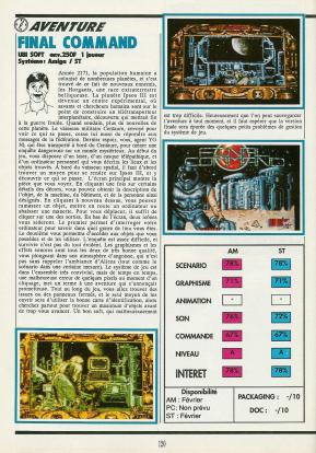 En conclusion "Final Command" est un petit jeu d'aventure, sans prétentieux un peu comme on les faisait sur Amstrad. Il reste bien en dessous des jeux tels que "B.A.T" mais est dans une catégorie très peu représentée sur micro : Le jeu d'aventure subjectif spatial, je n'en connais qu'un autre de ce type sur Atari ST, Star Trap de Loriciel. Il reste donc à découvrir pour ceux qui ne le connaissent pas et qui sait peut-etre qu'il vous plaira. Pour les plus vieux qui ont connu les jeux d'aventure 8 bits, je crois que ce jeu pourra vous tenir en haleine car il s'inscrit typiquement dans ce style de jeu où l'aventure prend le dessus sur le reste. Pour les autres faites vous votre opinion.
