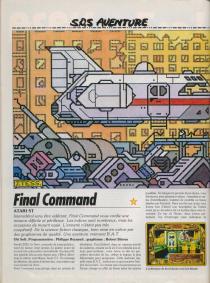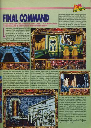 Sortie en 1990, "Final Command" est un jeu assez rare et méconnu. Ressemblant étrangement à "B.A.T" (Bureau des Affaires Temporelles) du même éditeur mais sans toutefois l' égaler, il s'en dégage une accroche que l'on peut avoir sur les jeux pas très beau mais qui vous force à en découvrir plus, en fait un peu comme sur les 8 bits. Vous commencez donc le jeu en débarquant sur le CENTAURE. Vous découvrez 2 cadavres dans la salle des commandes. Sur l'ordinateur de bord, un dernier message du capitaine indiquant qu'il y a un traite à la solde des Horgants. Le but du jeu est donc de partir sur la planète "IPSOS III" et de récupérer la banque de données concernant le télétransporteur à grande distance. Vous commencez votre mission avec : Un pistolet laser, un ordinateur de poche et un casque télépathique très utile pour parler avec les mutants.