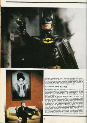 Ajouter à tout cela un Nicholson qui en fait des tonnes jouant un Joker trop caricaturale, énervant, presque trop heureux d'avoir su négocier un cachet indécent, dominant à l'inverse un Batman quasi transparent, schizophrène, à la limite de l'antipathie. Reste les superbes décors de Gotham, la B.O majestueuse de Danny Elfman, la Batmobile bien sûr et la superbe Kim Basinger dans un rôle qu'on peut qualifier de potiche de service, dont on prête d'ailleurs une courte relation avec le chanteur Prince et sa « Bat-danceeeeee », rencontré lors du tournage: