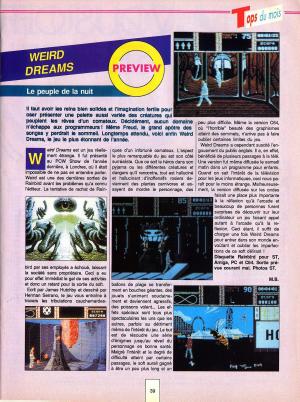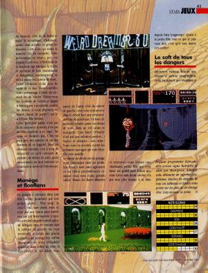 Difficile de rester de marbre devant "Weird Dreams", un jeu réellement étrange, dérangeant mais aussi innovant par le thème abordé. Malheureusement il confirme aussi l'adage que ce qui est beau, est ... beau. Le jeu est en effet entâché d'une difficulté extrême et affublé d'une maniabilité catastrophique, si bien que peu de personne se sont réellement accrochés au jeu. Des graphismes haut en couleurs, très détaillés au détriment du reste. Mais ce jeu est toujours aussi surprenant, inclassable je dirai même par son thème qui ne fut pas repris d'ailleur dans aucun jeu.