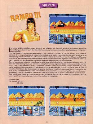 Rambo 3 est donc un bon jeu qui laissera certainement plus de souvenir à ceux qui l'ont connu sur Amstrad que sur Amiga. Le premier niveau demande une bonne dose de réflexion et ce n'est pas déplaisant. Malheureusement la faible intelligence des ennemis, l'absence de scrlling entre les écrans est une honte pour un 16 bits. Fan de Sly, si vous recherchez la castagne et à venger votre cher colonnel, passez votre chemin si par contre un peu de tir, beaucoup de stratégie et que vous aimez la magie des camps russes en Afghanistan la nuit... foncez.